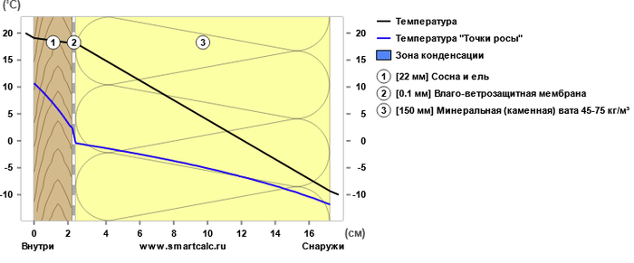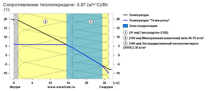 Да, это так. Если в качестве пароизоляции мы используем плёнку. Но, если в качестве пароизоляции мы используем 100 мм пенопласта, то конденсация на нём невозможна ни при каких условиях. Поверили? Вроде бы логично, раз пар не может выйти наружу через стены, он и оседать на них не должен. Но почему же тогда SmartCalc ругается на этот американский пирог, показывая влагонакопление?!