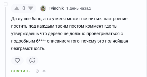 @Tvinchik - ты там хотел под каждым моим постом что-то писать про вентиляцию дерева? Вот тебе пост, где не только я утверждаю, что дерево не должно проветриваться. Надеюсь, у тебя будет настроение и ты не сольёшься также, как из нашей дискуссии #comment_381682936
