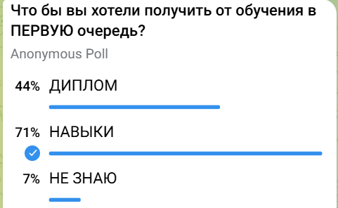 Мы собрали собственную статистику того, чего на самом деле хотят студенты. Все опрошенные (82 человека) являются студентами факультета журналистики РАНХиГС. 71% респондентов ответили, что от обучения в первую очередь хотели бы получить навыки, 42% при этом выбрали еще и диплом, и только 7% опрошенных ответили, что не знают, чего хотят. На вопрос о том, знают ли студенты, какие навыки им необходимы по окончании университета 78% ответили “ДА”.