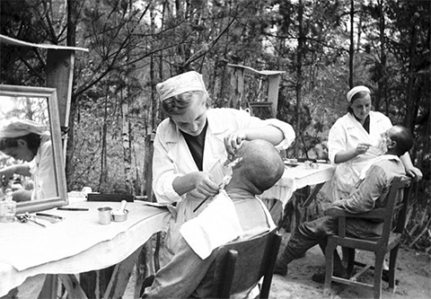 Стрижка и бритье бойцов в прифронтовой парикмахерской. Фото из фондов РГАКФД
