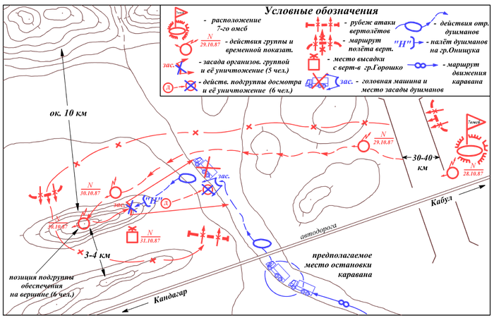 — Онищук все рассчитал. В пять тридцать выслал прикрытие из четырех человек: двух пулемётчиков (рядовой Яшар Мурадов, рядовой Марат Мурадян) и двух автоматчиков (рядовой Михаил Хроленко, младший сержант Роман Сидоренко). Задача группе: расположиться на близлежащей к машине господствующей высотке и в случае необходимости прикрывать досмотровую группу. В пять сорок-пять Онищук с пятью бойцами выдвинулся к машине. Меня с пятью бойцами в числе которых были радисты Николай Окипский, Миша Деревянко, пулеметчик Игорь Москаленко, сержант Марих Нифталиев, рядовой Абдухаким Нишанов, оставил на прежнем месте и поставил задачу наладить связь с батальоном, а в случае необходимости поддержать огнем.
