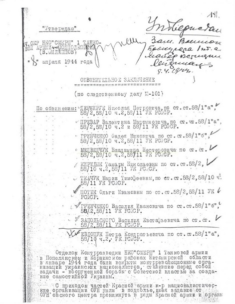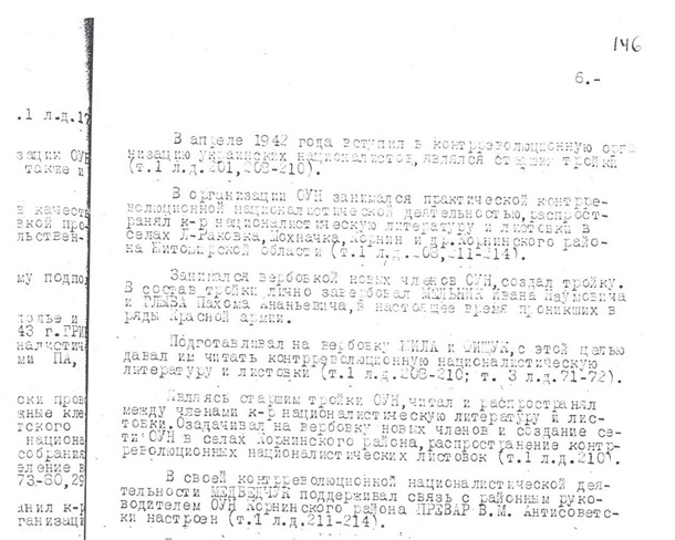 Владимир Нестерович Медведчук в детстве перенёс туберкулез позвоночника и костей, поэтому в армию призван не был. Вскоре после того, как Красная армия освободила Житомирскую обл., СМЕРШ арестовала его как члена ОУН. Судя по обвинительному акту, он вступил в организацию в апреле 1942 г. и был там «старшим тройки». «В организации ОУН занимался практической контрреволюционной националистической деятельностью, распространял контрреволюционную националистическую литературу и листовки в селах Л-Раковка, Мохначка, Корнин и другие Корнинского района Житомирской области», – гласит страница 11 заключения.