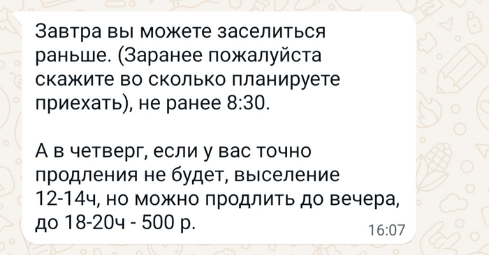 Просто пару раз удалось найти адекватные варианты. Например: снимала квартиру почти в центре Красноярска, ремонт свежий и красивый, кухонных поверхностей правда так же немного. Цена была 2000 за сутки, залог 1000. Заселение с 14, выезд до 12(можно и до 14). Поезд мой приходил вообще в 8 утра, договорилась с хозяйкой о возможности пораньше заехать - вообще без вопросов, доп.платы не брала никакой. Предлагала продлить выезд до вечера, если это необходимо за 500р (до 18-20 часов вечера).