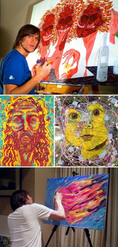 С раннего детства Джим Керри любил рисовать и не изменил своему хобби, даже когда стал знаменитым актером. Как художника его привлекает фактура акрила: густая и яркая краска позволяет совершать различные манипуляции. Эту краску он может наносить на работы обычными кисточками и огромными кистями, выливать прямо на холсты и размазывать пальцами. Джим Керри - экспериментатор по натуре: например, он наносит влажную краску поверх высохшего красочного слоя, затем соскабливает поверхность, создавая иллюзию шелкографии. Иногда может разрезать готовую картину и сшить ее заново.