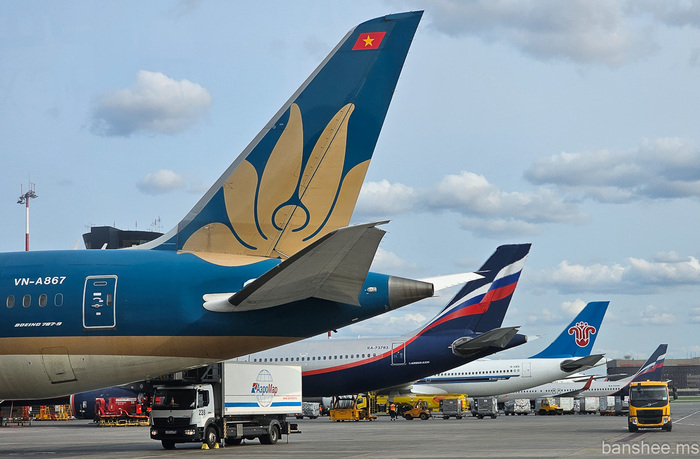Потому приехал в Москву, заглянул по пути на СРВ, сделав фото несостоявшегося теплохода и поехал в Шереметьево. Самолёт там был на дальней стоянке, куда ехали на автобусе. По пути полюбовались на хвосты.