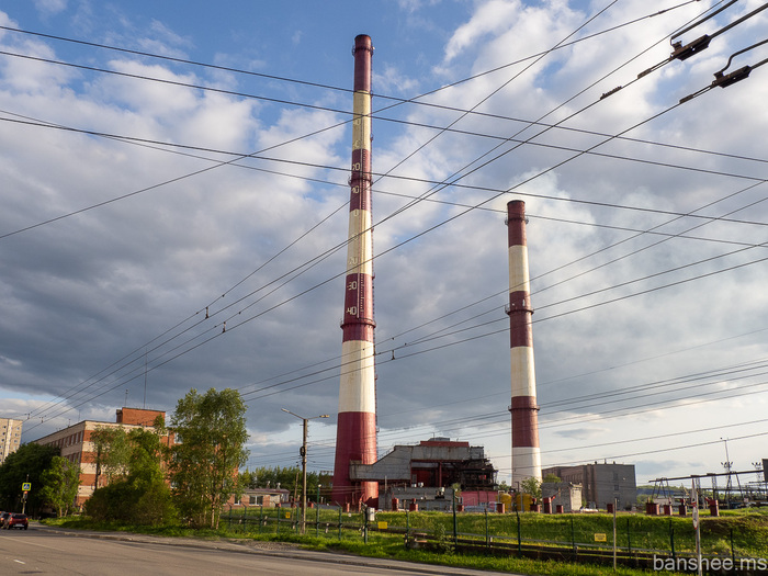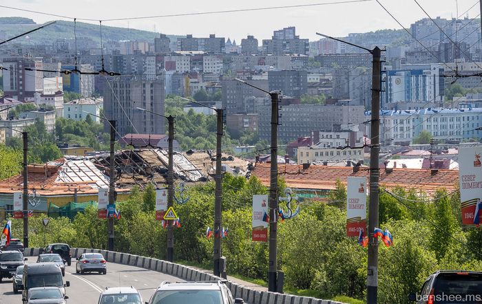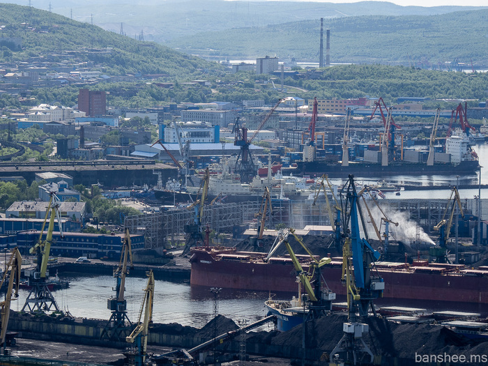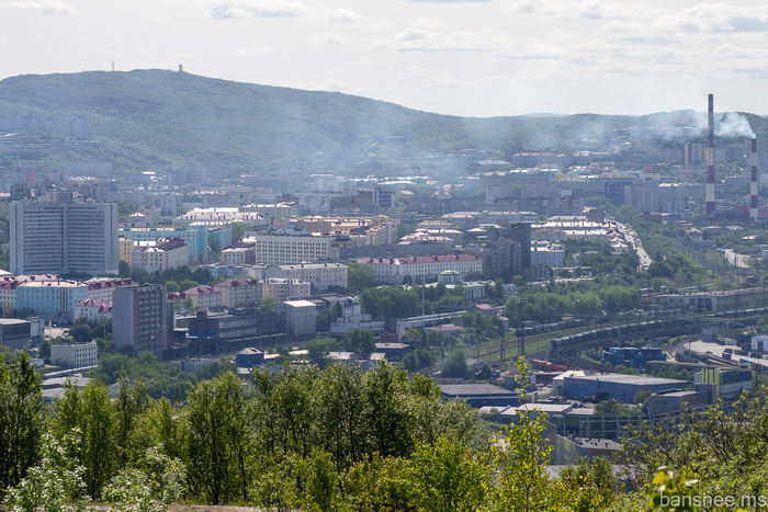 Панорама центра города. Слева — гостиница «Азимут» на площади Пяти Углов, вроде как самое высокое здание в городе. В самом центре небольшое зелёное здание с башенкой и куполом — ЖД-вокзал. Справа — трубы мурманской ТЭЦ.