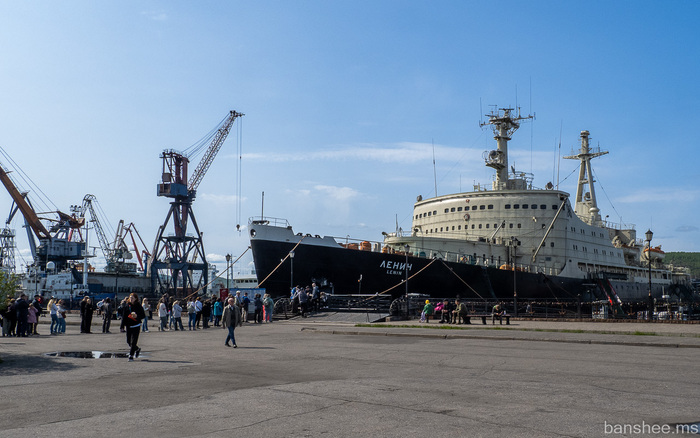 Одна из городских точек притяжения туристов — это музейный атомный ледокол «Ленин». К сожалению, процесс посещения на нём организован исключительно в порядке живой очереди. Раз в полтора часа туда запускают три-четыре группы по 20 человек, потом следующая порция посетителей идёт опять через полтора часа. Так что в день на ледокол может попасть 200-250 человек. Когда я пришел, до входа оставалось около часа. Постоял, 60 человек запустили, я в очереди оказался примерно семидесятым. Если бы постоял ещё полтора часа, то попал бы. Но решил, что оно того не стоит. Потом как-нибудь. Ледокол штука пусть и уникальная, но никуда не уйдёт, в отличие от погоды. А погода была хорошая, так что лучше было просто гулять, а не торчать в очередях.