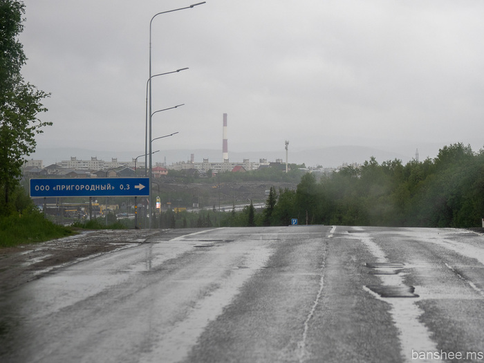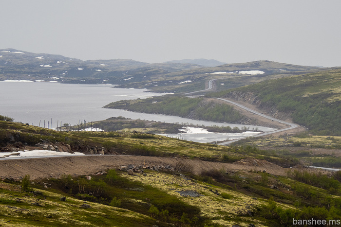 Виды были большей частью тундровые. А дорога была вполне пристойная. Некоторые части ещё достраивались, некоторые уже ремонтировались, но большую часть пути водитель держал скорость больше сотни. На фото — Верхнетериберское водохранилище.