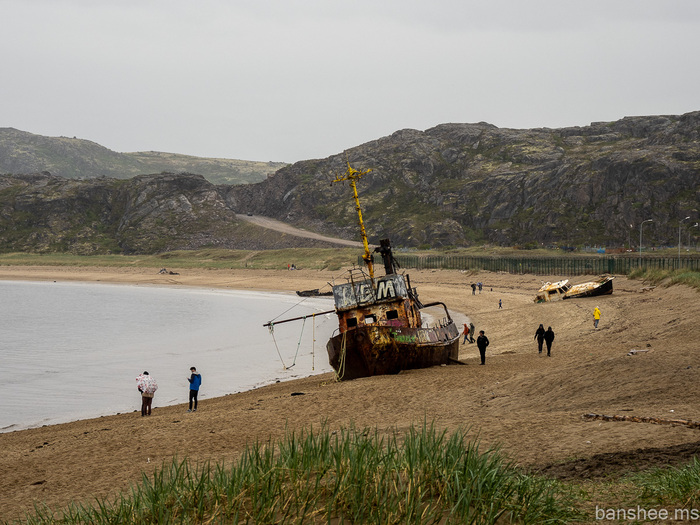 А на берегу в старой Териберке лежит «скелет левиафана». Это реквизит от одноименного фильма, который снимался в этих краях. Скелет искусственный, но крупный, потому для привлечения туристов работает.