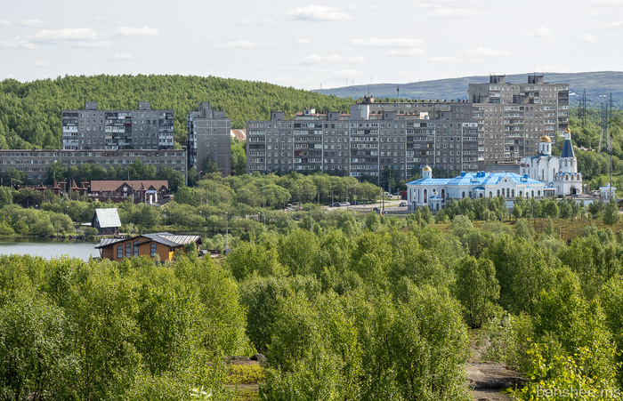 Есть в Мурманске и парки (на переднем плане, даже с озером), и церкви (Церковь Спаса Преображения на Водах), и куча панельных многоэтажек.