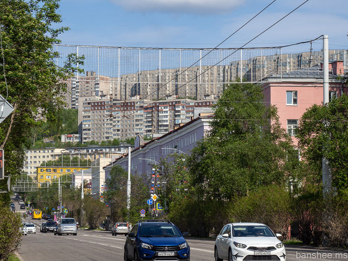 Пять углов — это центральная площадь Мурманска. На ней был ремонт (заборчик по левой границе кадра), потому саму площадь фотографировать не стал, не интересно пока. Снял панораму проспекта Ленина, которая показывает многоуровневый мурманский рельеф. Город от воды несколькими «террасами» поднимается на близлежащие сопки.