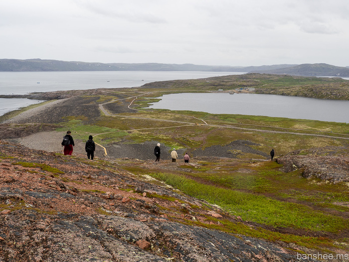 После этого нас повезли в «природный парк Териберка». Там планировали посмотреть на тундру, водопад, пляж «драконьи яйца» и что под руку попадётся. По пути проехали мимо новой Териберки. Официально — посёлок Лодейное. Озеро тоже Лодейное.
