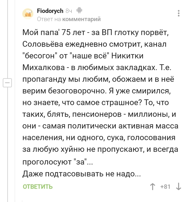 Я такой же пенсионер как твой папа. Я тоже смотрю все эти передачи. при этом прекрасно понимаю что Соловьёв, Скобеева со своим мужем, Киселев и многие другие пропаганда действующей власти. Я понимаю кто они и не испытываю к ним ни малейшего уважения. Я более менее отношусь к Норкину, он анекдоты рассказывает. К Михаилову, скорее нейтрально, у него есть интересные передачи и хорошие фильмы. На выборы не хожу, потому что хорошо знаю кухню выборной компании. Но вот что самое интересное. не согласен я пока на смену режима. Давно живу, знаю, сменится режим и в моем городе не только воды не будет. Не будет продуктов, бензина, жилья, работы, нихрена не будет. При любой смене режима. Я это уже пережил. Вот если бы в результате честных выборов пришёл например кто то другой, Платошкин например, а по мне так лучше Сталин. Это одно, но такого не произойдёт. В нашей стране , только через переворот, а это обязательно смена режима, обязательно передел собственности, грабёж население, обнищание, разруха. Вам тоже предстоит это пережить. Путин в конце концов просто умрет когда нибудь и не думайте что все вдруг станет зашибись. А что касается этого города, таких городов в России как грязи, страна большая, везде сидят местные царьки. Ни один демократически настроенный правитель с этим не справиться. Кстати я как то спросил у своей бабушки, которая прожила 94 года и застала наш период капитализма, в какое время по её мнению было жить в стране лучше всего. Она сказала при Сталине. В магазинах были все продукты, мясо, колбасы, сыры, даже чёрная икра была доступна каждому. Качество продуктов и товаров потребления было очень высоким. Например форму учащимся ПТУ шли из кошемира высшего качества. Дварцы пионеров, школы, детские лагеря отдыха, больницы. Все было для людей и все работало как часы. Зарплата постоянно увеличивалась, а цены в магазинах снижались. И много чего другого. Не думаю что моя бабушка хотела меня обмануть. Вот такая фигня.