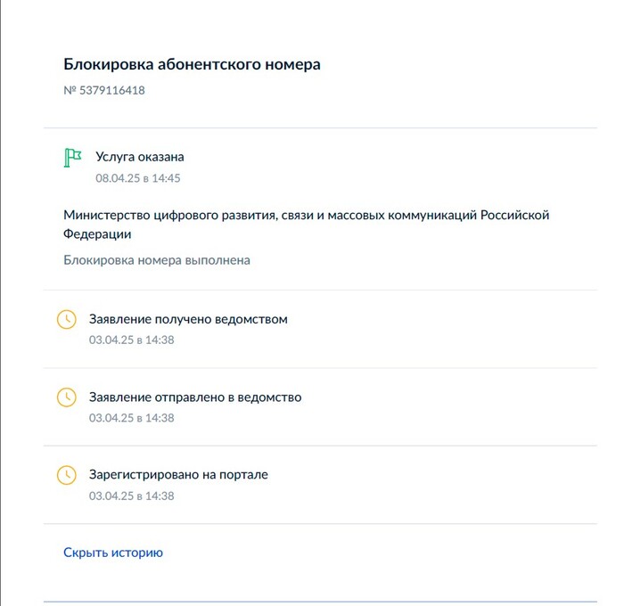 3 апреля 2025 года через Госуслуги я подал заявление на блокировку номера. 8 апреля на заявление пришел ответ: услуга оказана.