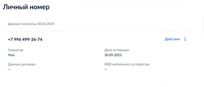 У меня в профиле Госуслуг с момента активации отображения сим-карт числится абонентский номер +7 996 4993674. Номер мне неизвестен, но дата активации номера на Госуслугах совпадает с датой перехода в Йоту от оператора Теле2 с переносом номера.