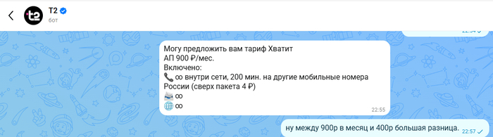 По итогу я сообщил им, что планирую перейти к другому оператору (не буду писать название, чтобы не считали рекламой), который предлагает мне за 400р в месяц безлимитный интернет (сейчас я плачу у Т2 530р за 8гб в месяц и не работающий безлимит для ВК), на что мне предложили остаться с удивительно выгодным предложением - 900р в месяц и безлимит на интернет. Выглядит крайне заманчиво.