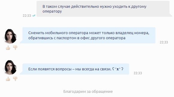PS: хотел обратить внимание на уровень поддержки в другого оператора - там мне ответили в их чате через 1 минуту, а чат-бот сам сразу предложил перевести на оператора.