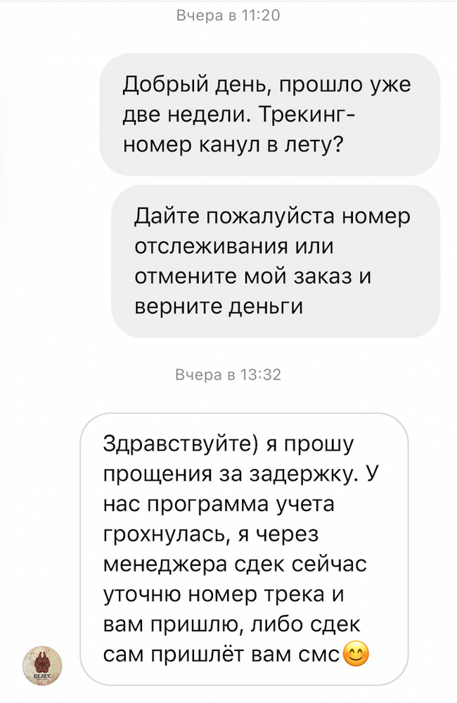 Поскольку к этому времени я уже почитала пост @mghand, то настроения ожидать "чуда" уже нет. Да и по ЗПП - сроки отгрузки давно нарушены. Поэтому требую или выдать трекинг-номер, или вернуть деньги. На что получаю информацию, что у них "программа учета грохнулась" и сейчас уточнят информацию у менеджера СДЭКа.