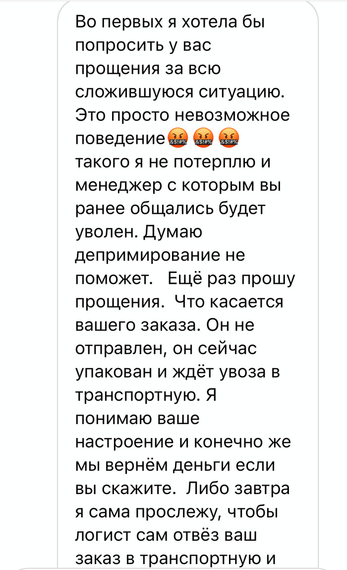 Начинаем с ней обсуждать возможность воздействия, и тут она говорит, что написала мужчине, который указан в группе ВК в качестве "контакта". Мужчина ей ответил, что сообщит владелице бизнеса. И уже владелица бизнеса с ней связалась через WhatsApp и начала рассказывать, что она в шоке, только сейчас узнала, что себе позволяют менеджеры (ну конечно же, мы "верим"), она обязательно уволит провинившегося. При этом заказ выполнен, упакован, но на самом деле не отправлен, и в качестве извинения давайте я вам вышлю заказ завтра, а вдовесок еще подарочек внутрь вложу. Но не забывает упомянуть, что может и деньги вернуть.
