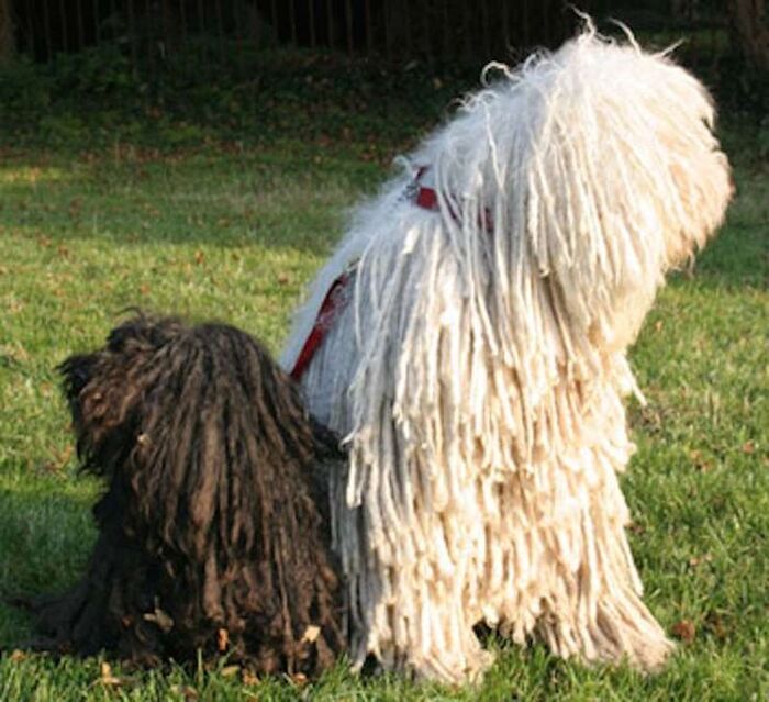 Комондор и пули это венгерские собачки. Венгры в принципе любят выделиться из толпы и язык у них странный и собаки национальные с приколами. Обе эти собаки овчарки, но задачи выполняют разные. Комондор охраняет стада, это крепкая и жесткая собака, любящая постукать всякое. А пули - гоняет овец. Пули очень шустрая, веселая собака, обладающая живым умом. Они легко обучаются и очень ориентированы на человека, потому отлично подойдут для спорта. И главная мулечка - шерсть. Такой тип шерсти называется шнуровым и его носят еще бергамаско. Раньше еще пудели с таким типом шерсти были, но канули в Лету. Жаль. Щенок пули рождается просто пушистым пупсиком, но к 10-12 месяцам, после смены щенячьей шерсти на взрослую, она начинает сбиваться в колтуны. Можно бросить на самотек, шерсть собьется в пластины. А можно ручками формировать красивые, ровные шнуры. После формирования остается только укорачивать шнуры по мере отрастания до приемлемой длины и проводить гигиеническую стрижку головы и попы. И всё. Собачка выглядит прикольно, шерстью не разбрасывается, при регулярном мытье не пахнет и умненькая ещё. Большой плюс пули перед комондором это то, что заплести шнуры на 15кг собачке значительно проще, чем на 60кг. Просто поверьте, много дредов это красиво, но тяжело физически. Ну и она не постукает соседа, что приятно.