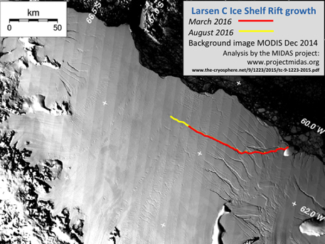 Трещина растянулась на 130 километров. Если она продолжит расти, от ледника отколется айсберг, размерами сравнимый с Шотландией. А ледник потеряет 10 процентов своей территории.