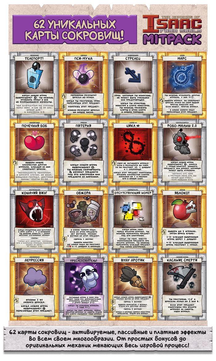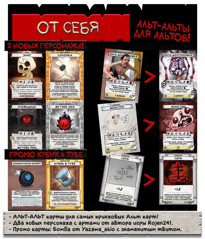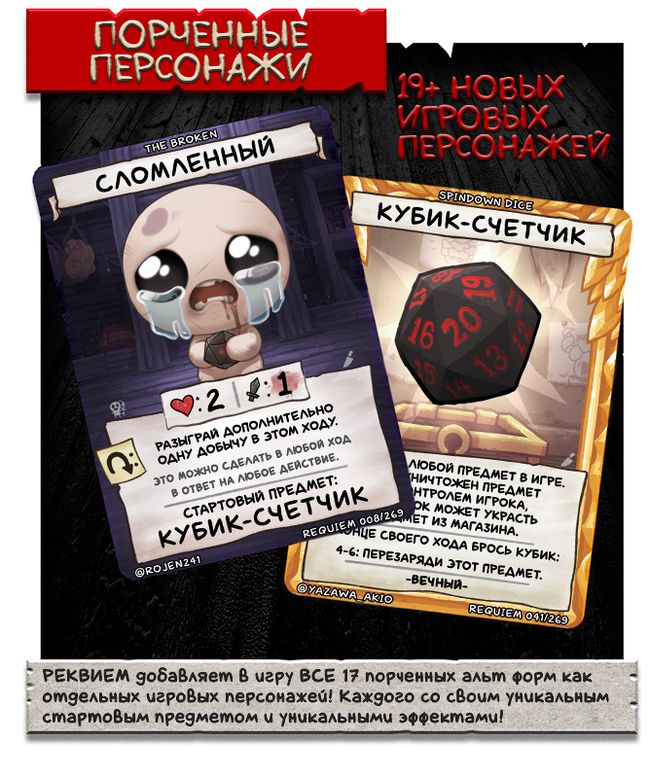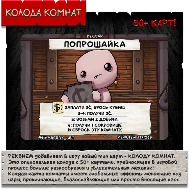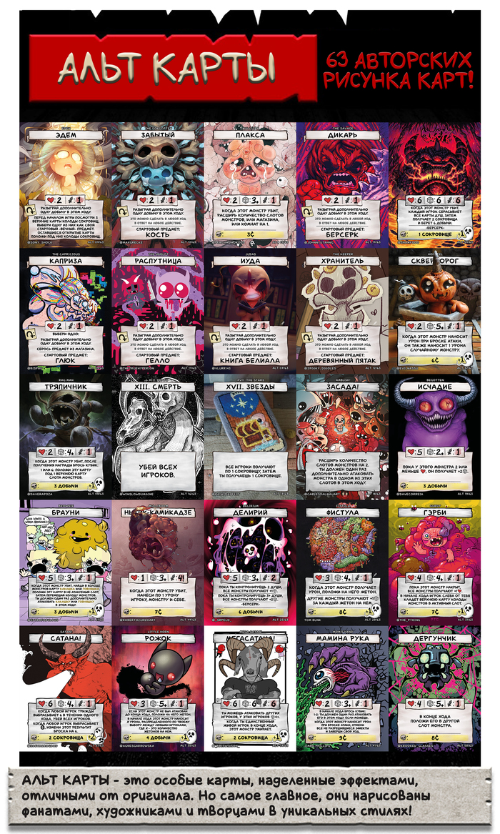 Для Исаака есть множество фанатских дополнений, как и для любой хорошей настолки. Но несколько из них выполнены, без преувеличения, не хуже, а то и лучше оригинала. Пару маленьких колод я уже перевел, но впереди еще много материала по 3-м самым большим и интересным допам - о них в следующем посте.