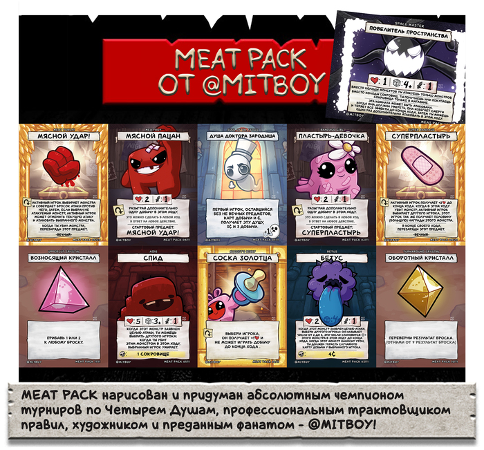 В конце 2018 по просьбе подписчика я взялся за беглый перевод The Binding of Isaac: Four souls, я совершенно не был знаком с предысторией - компьютерной игрой, автором - Макмилленом и его творчеством. Я не знал об игре ровным счетом ничего. На тот момент переводы шуточного Joking Hazard и элементарных Манчкинов представляли собой приятное хобби, отлично подходящее под вечернюю чашечку цикория. Столкнувшись с Исааком я даже не заподозрил насколько важен серьезный подход к каждому слову в этой игре.