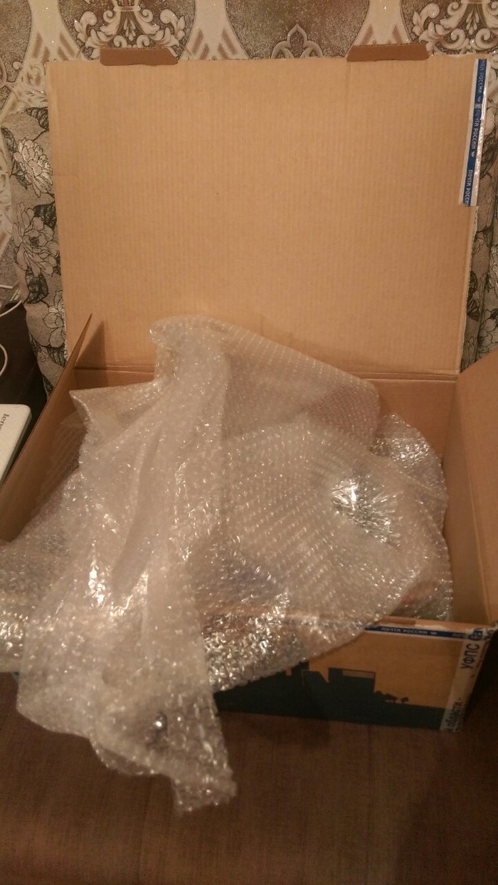Пришлось немного помучиться, потому что муж был на работе и кричал мне в трубку: "Не открывай без меня! Я тоже хочу посмотреть!" Я ответственно ждала (чуть с ума не сошла, если честно). И вот, первый подарок! Офигительное количество пупырчатой пленки. Всё, теперь я буду спокойна, как слон =)
