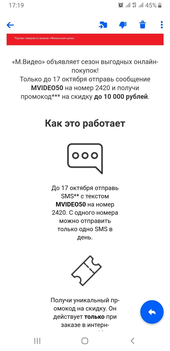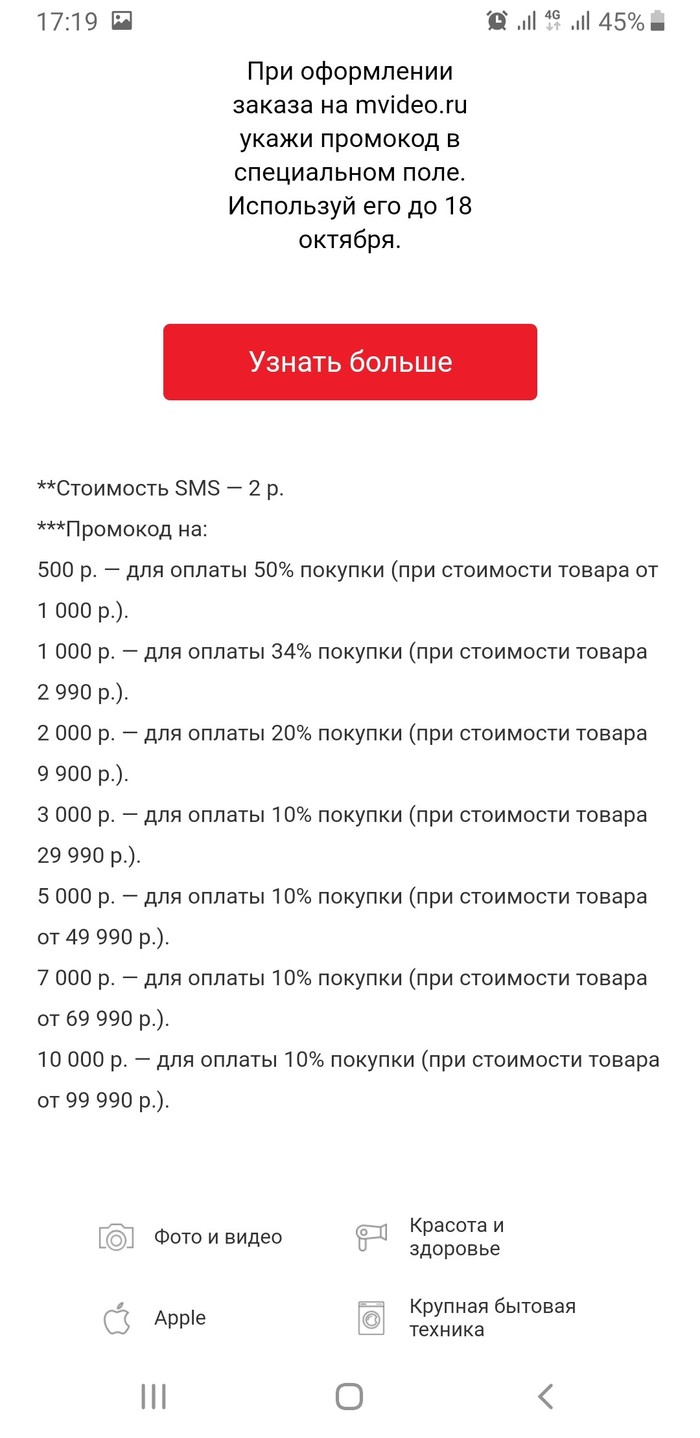 Сейчас (20.07.2019) идет акция в МВидео: отправь sms "MVIDEO SALE" на номер 2420 (можно по разу каждый день) и получи промокод. Номиналы разные (и не для всех городов возможно): https://www.mvideo.ru/promo/skidki-na-vse-do-99?utm_medium=c...
