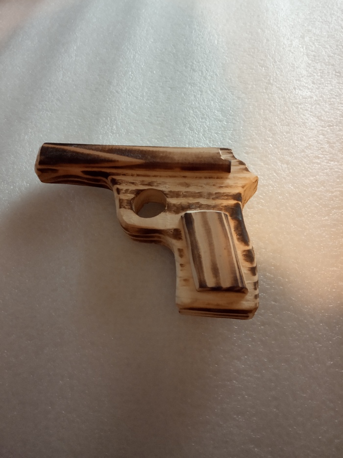 Мой муж изготавливает из дерева танки, пистолеты, пулеметы, СВД, автоматы и прочие штуки. Потом он все это добро обжигает, и получается вот такая приколюха. Да, еще при необходимости делает надпись.