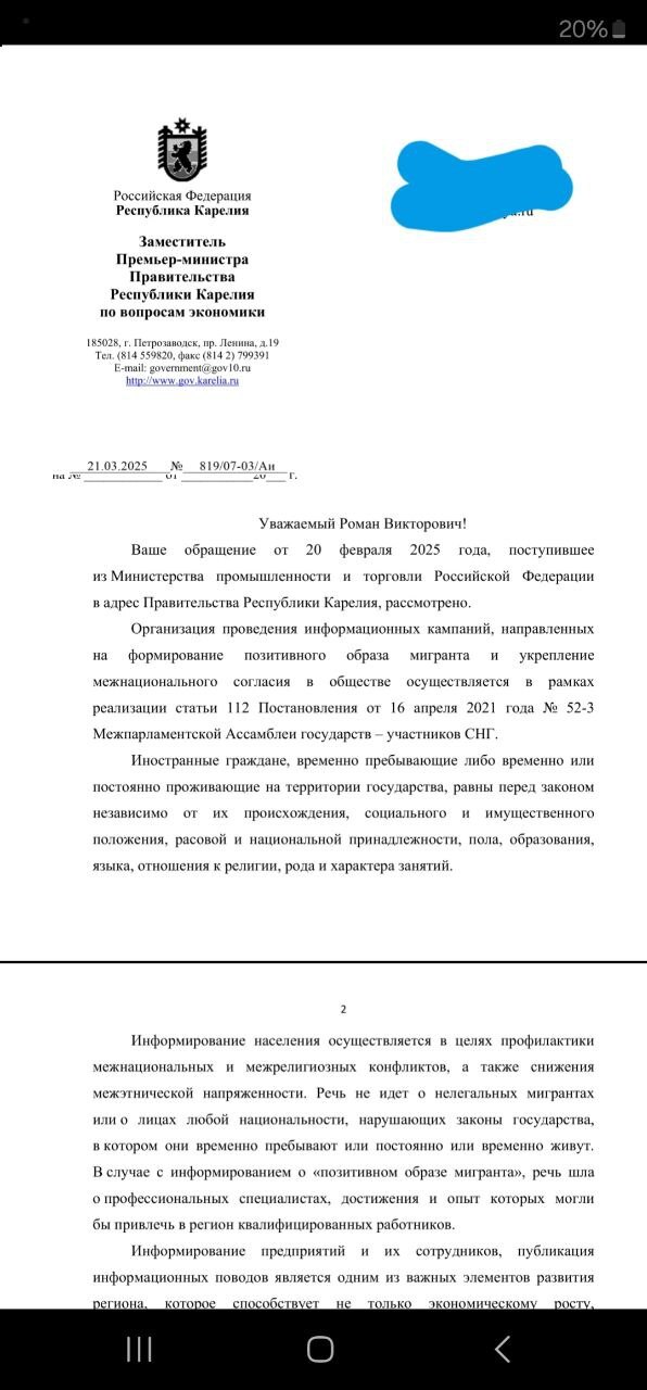 3. Теперь к карельским чиновникам, а именно – к Министру экономического развития Республики Карелия Ермолаеву Олегу Александровичу вопрос. Вы почему в официальных ответах гражданам ссылаетесь на рекомендательный документ, написанный в 2021 году, у которого в названии есть пометка "в период пандемии"? Кто ещё работает по этому документу? Зачем? Кто вам сказал так делать?