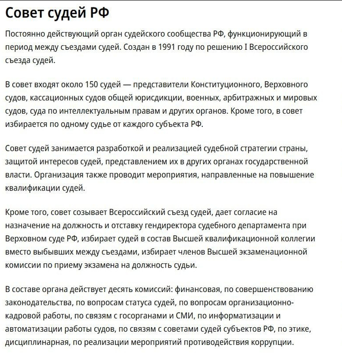 Совет Судей Российской Федерации. Первый раз слышу о таком органе) Но я вообще из деревни, мне простительно. Впрочем, они тоже особо не афишируют своё существование и даже неизвестно сколько народу туда входит. Но пишут, что около 150 человек. То есть дропнули десятую часть, плюс-минус.
