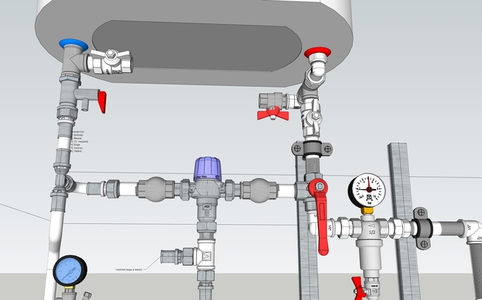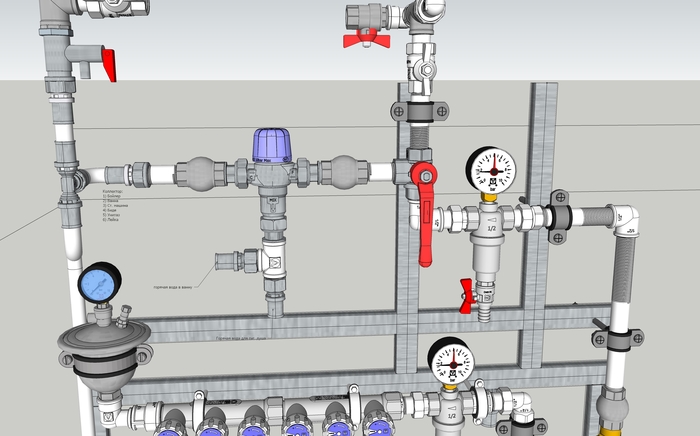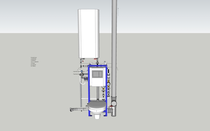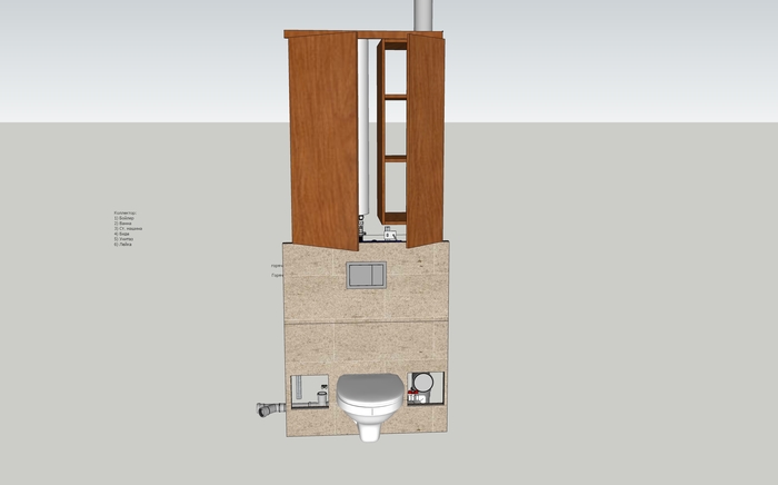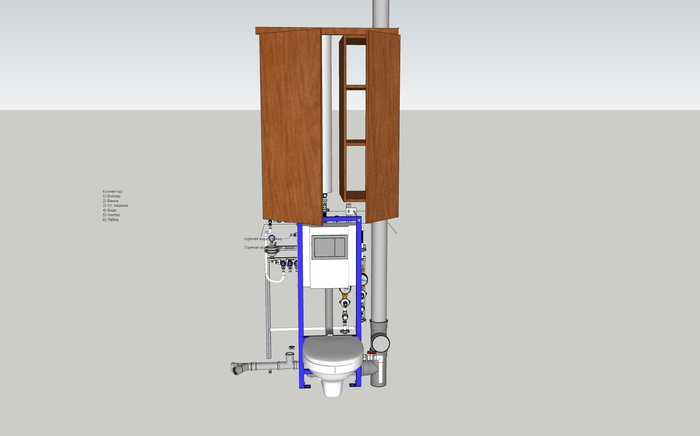 Поскольку пространство очень компактное, то вся система уйдет за инсталяцию. Основные "рычаги управления" я возможно еще подниму немного выше, чтобы упростить доступ. Но в целом будет примерно так как на картинках. Инсталяция будет зашита съемной обшивкой по типу Устройство съемной задней стенки в туалете от @CorrectBoy.