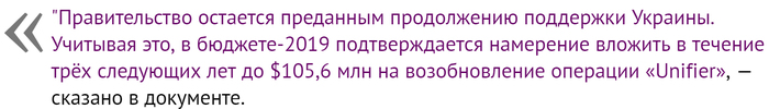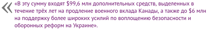 ОТТАВА, 21 марта 2019, 10:26 — REGNUM В течение трёх лет Канада предоставит Украине военную помощь на сумму $105,6 млн, сказано в проекте бюджета, который находится на рассмотрении парламенте Канады, сообщило 21 марта информационное агентство «Укринформ».