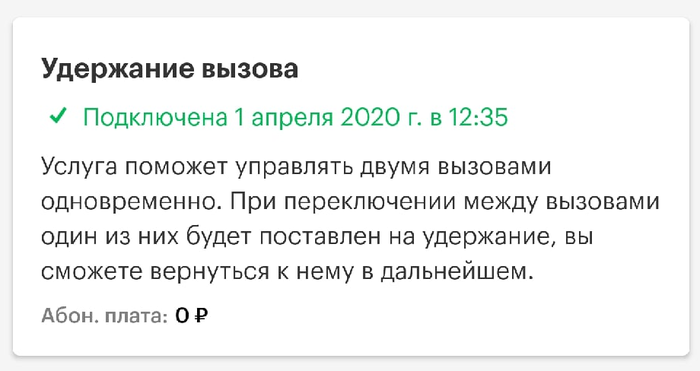 Захожу в ЛК Мегафона, проваливаюсь в управление услугами, там 7 штук и все без абонентской платы. Нахожу там "Удержание вызова"