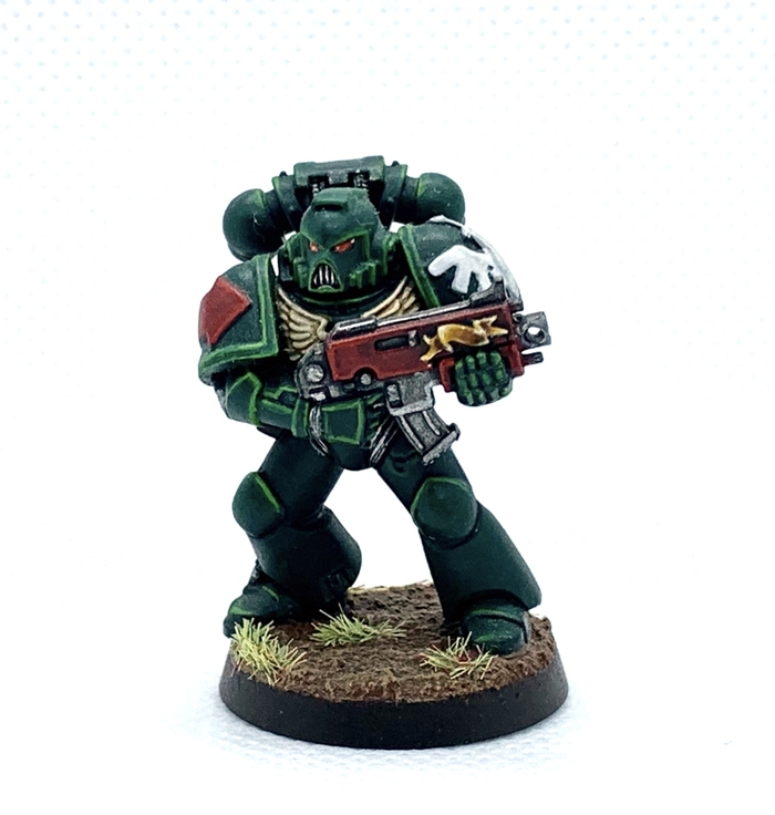 У меня загрунтовалось не очень в районе болтера, так что там я снял краску.