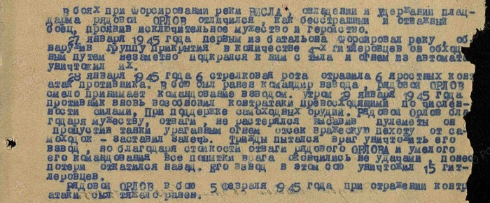 "В боях при форсировании реки ВИСЛА, овладении и удержании плацдарма рядовой Орлов отличился, как бесстрашный и отважный боец, проявив исключительное мужество и геройство.