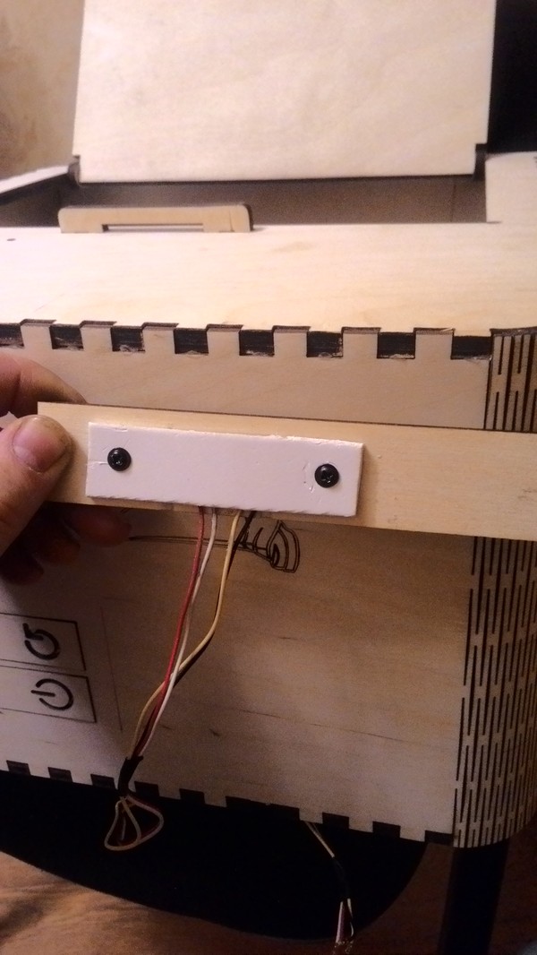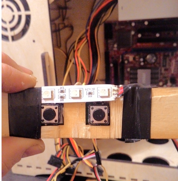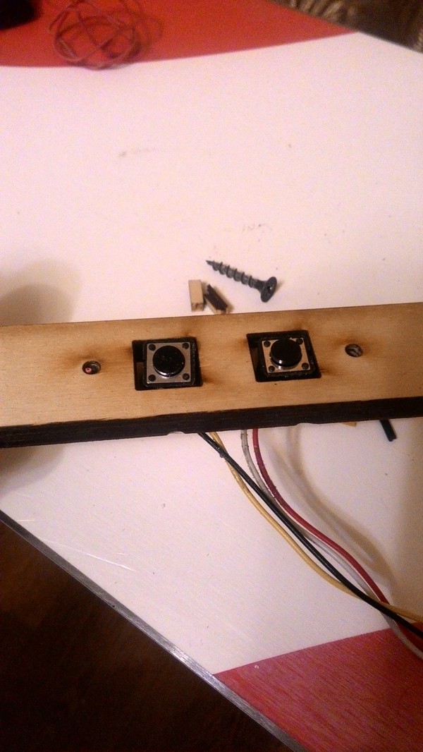 потом пришла в голову идея про свет из кнопок, и решено было снять один слой фанеры чтобы светодиоды не мешали нажатию кнопок. крепеж планки - встает плотно в распор и проклеивается.