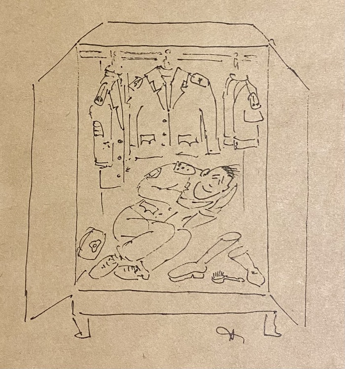 Приказы начальства не обсуждаются, поэтому в следующую холодную ночь пьяный Малёк уснул в шкафу (законсервировав себя во избежание запаха), полу стоя среди шинелей и милицейских брюк, для упора головы используя дверь шкафа. В эту ночь он был похож на атланта, держащего на себе не просто небо, а целый юридический ВУЗ.