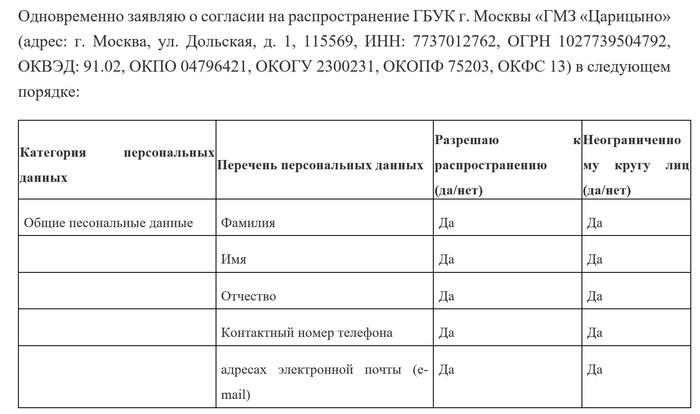 У музея Царицино договор со сторонней конторой на оказание услуг продажи билетов. Они не знают, что эта контора делает с персональными данными. Поэтому они берут согласие на то, что могут слить ваши персональные данные кому угодно. А поскольку вы сами на это согласились, то это законно.