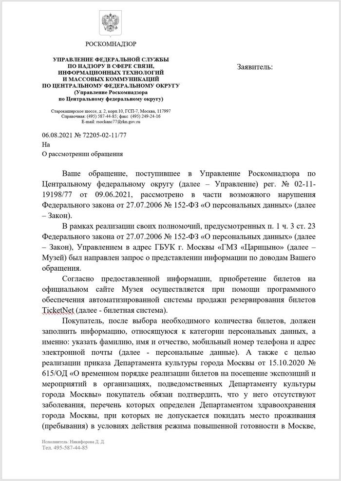 Мне сложно сейчас сказать в чем проблема, в законах, в тексте моего запроса в РКН или в том, что РКН, одной из функций которого является защита прав субъектов персональных данных, не очень то эти права и защищает. Но ситуация, когда для посещения государственного объекта культуры тебе приходится давать свои фамилию, имя, отчество, телефон и почтовый ящик, а они просто их сливают, не нормальна.