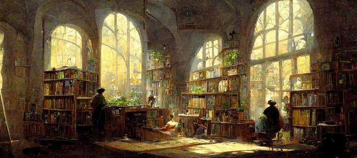 - Old gorgeous library, tall windows, Carl Spitzweg (старая библиотека в стиле Карла Шпицвега)