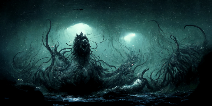- Terrifying nightmarish huge creepy dark mystical creature under deep ocean (ужасающее мистическое существо в глубинах океана)