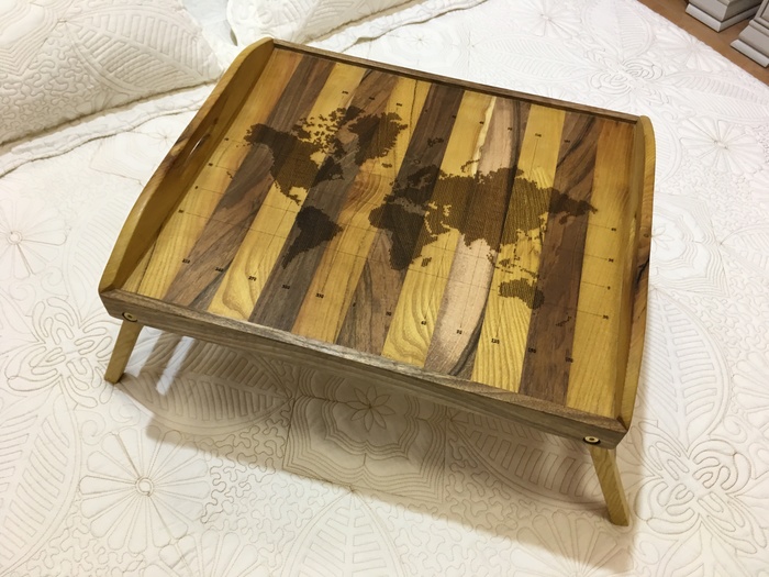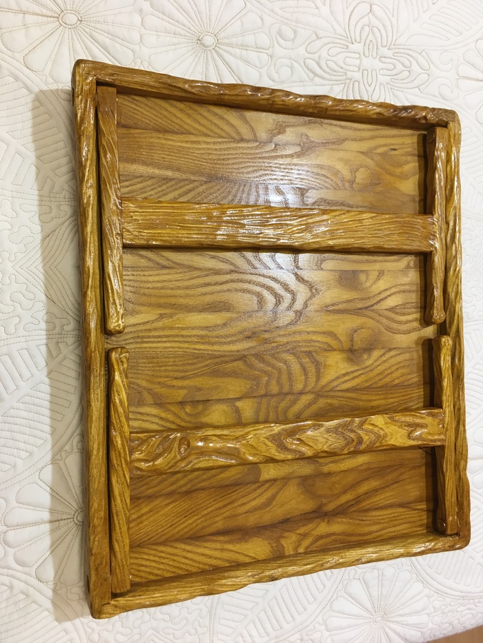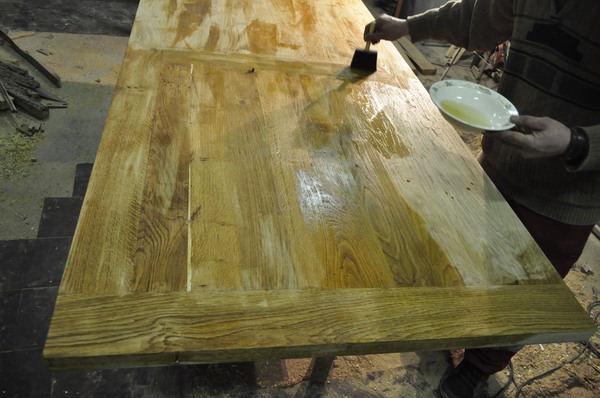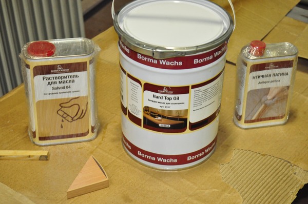 Покрываем твердеющим маслом для столешниц. В инструкции все подробно написано. От себя совет – не стоит лить большим объемом, лучше втирать помалу. Большие капли быстро высыхают и трудно удаляются. После первого слоя можно повторить. Я сделал три раза. Узор сразу начинает играть контрастом цветов.