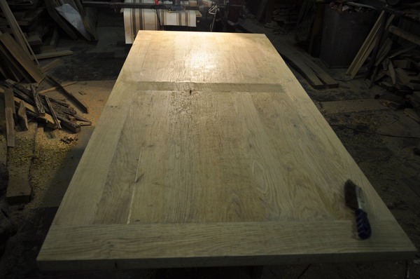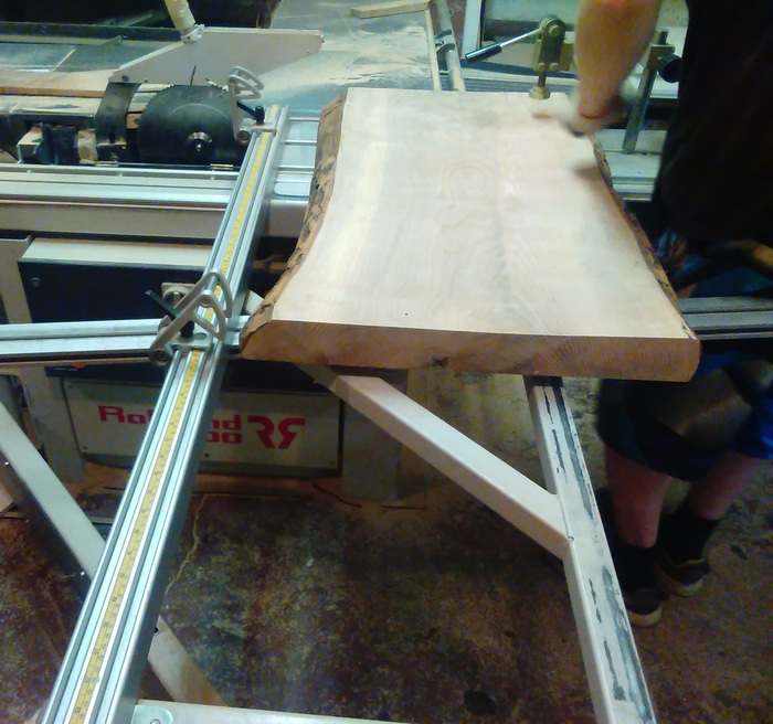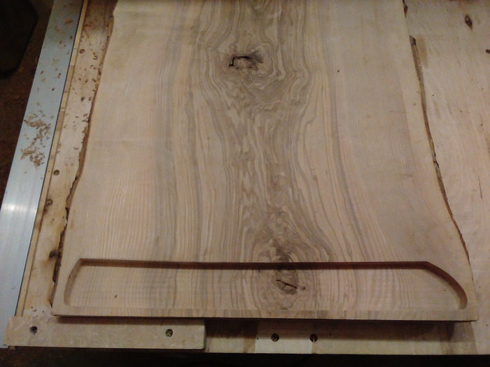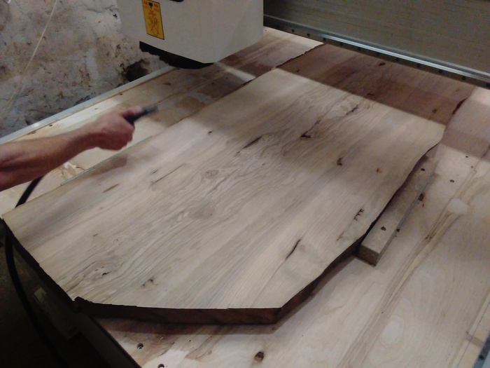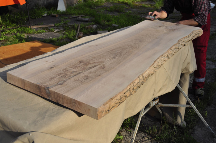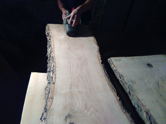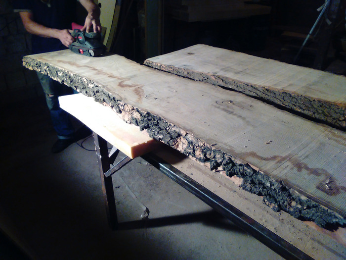 Тыльную сторону решено было шлифовать вручную, от времени геометрия доски немного изменилась. Если выравнивать всю поверхность – «украдется» толщина. Да и небольшая неровность под столом, в сочетании с корой будет выглядеть недурственно.