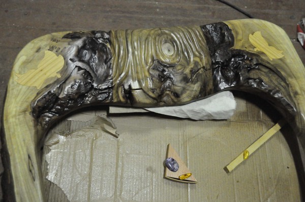 Все сучки, сколы и трещины заливаем эпоксидной смолой, лучше брать подороже, по типу «кристалл», она не желтеет со временем и используется для ювелирных изделий. Сквозные отверстия заклеиваем малярным скотчем или заливаем силиконовым герметиком, чтобы можно было аккуратно отодрать. Из личного опыта, смоле лучше дать отстояться несколько дней. Бывают ситуации, что сверху схватилось, внутри нет. Поэтому лучше подождать, даже если написано – быстросохнущая. Затем все шлифуется и полируется наждачной бумагой от P80 до P2500.