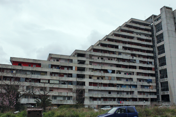 Скампия находится на перефирии Неаполя, и по всему периметру витает атмосфера безысходности... На самом деле сериал производит больше впечатление так как практически весь сценарий можно найти в реальных архивах хроники города... и война кланов, и поджеги людей, сохранились даже дырки в стенах, через которые осуществлялась продажа героина... Ныне, этот район не столь криминален, как в прошлом, однако и сейчас незнакомцам здесь не рады. Как и в сериале, в разных точках стоят дети на стреме, и действительно, уже через пять минут нахождения в самом сердце Скампии, к нам подъехал парень на мото, с целью выяснить кто мы, что здесь сделаем, и почему делаем фото.