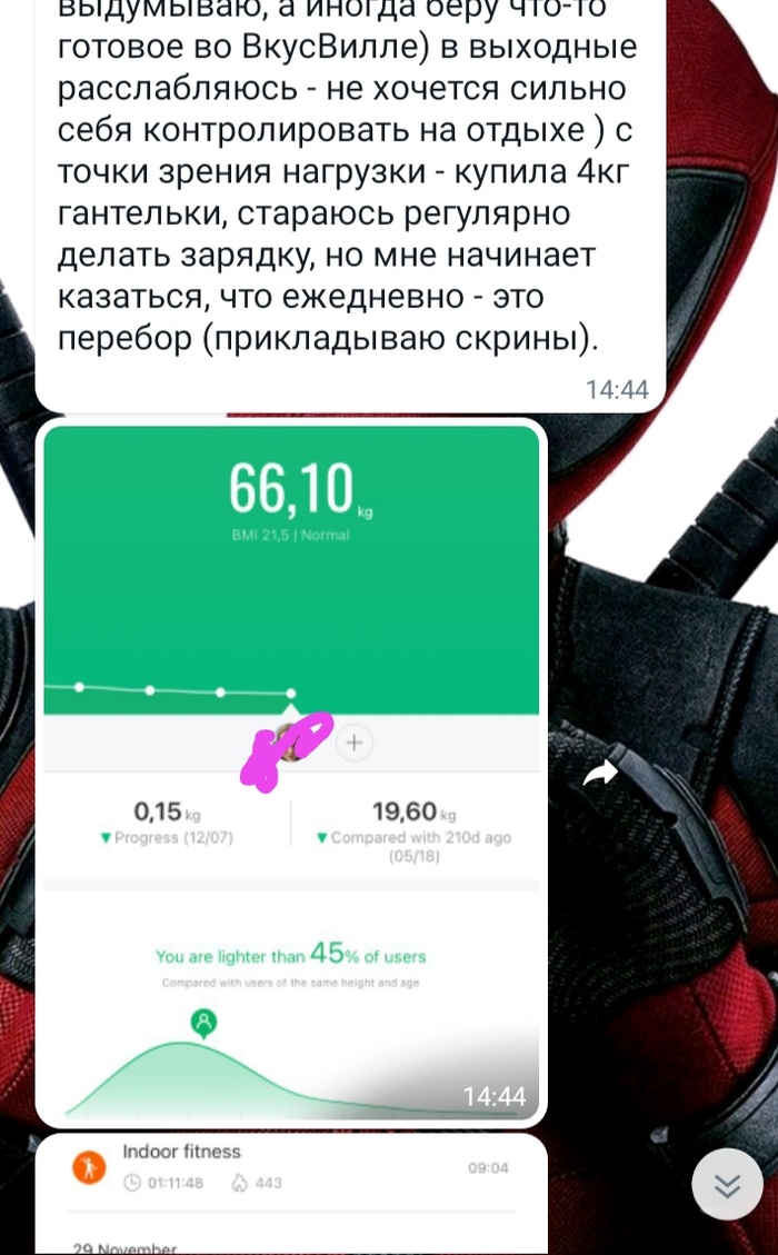 127кг - 114кг за два месяца, почти без тренировок из-за травм, с периодическими загулами)) Неплохо, ящетаю))