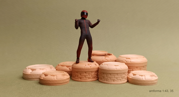Фигурки распечатаны в масштабе 1:18 из фотополимера Harzlabs, Tough Grey, высотой слоя 35 мкм.
