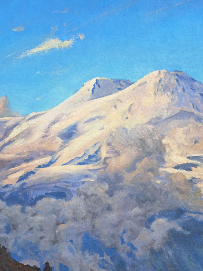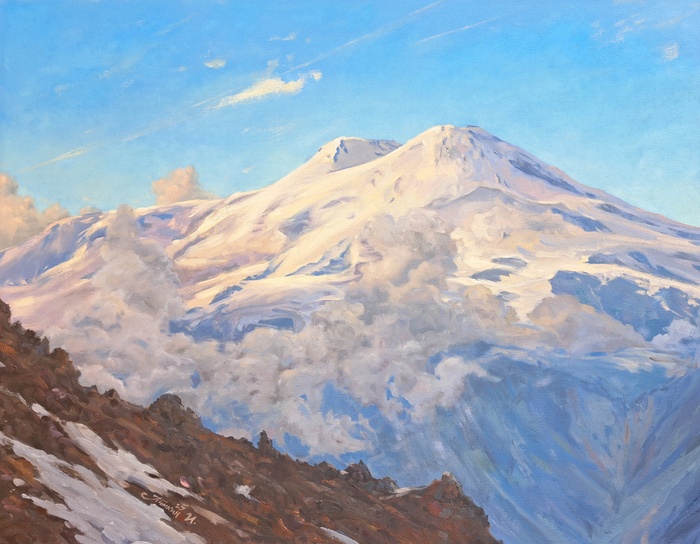 Спуск с горы Большой Когутай с видом на Эльбрус, Кавказ.